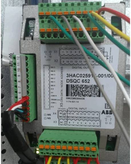 圖所示為 DSQC652通訊板,上下各有兩排端子,包含16個(gè)數(shù)字輸入和16個(gè)數(shù)字輸出,每一個(gè)接口對(duì)應(yīng)一個(gè)地址,例如X1.1對(duì)應(yīng)數(shù)字輸出0號(hào)地址(do0),X1.2 對(duì)用數(shù)字輸出1號(hào)地址(do1),X3.1對(duì)應(yīng)數(shù)字輸入0號(hào)地址(di0),X3.2對(duì)應(yīng)數(shù)字輸入的1號(hào)地址(di1),依此類推下去。每個(gè)端子排的9接 703 號(hào)線(COM),10接704號(hào)線(+24V)。
