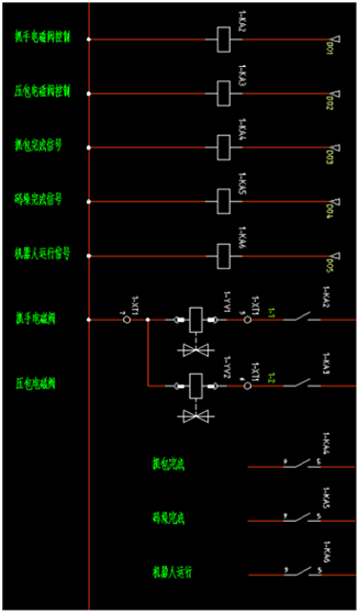 前三個(gè)為氣缸磁性開(kāi)關(guān)檢測(cè)信號(hào),后兩個(gè)為配套PLC傳送給機(jī)器人大包和托盤(pán)準(zhǔn)備好的信號(hào),為了實(shí)現(xiàn)電氣隔離,需要將PLC給機(jī)器人的電平信號(hào)轉(zhuǎn)化為機(jī)器人自身的電平,需要通過(guò)繼電器來(lái)實(shí)現(xiàn)。