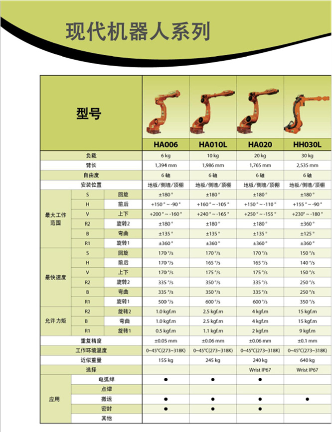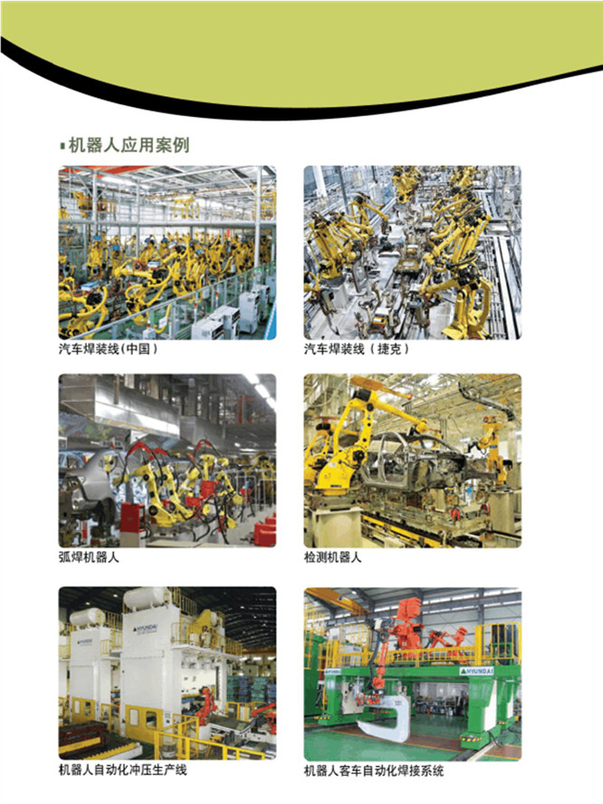 直角坐標(biāo)型工業(yè)機器人 、 圓柱坐標(biāo)型工業(yè)機器人、 圓柱坐標(biāo)型工業(yè)機器人 、多關(guān)節(jié)型工業(yè)機器人、平面關(guān)節(jié)型工業(yè)機器人?;『笝C器人、 激光焊機器人、電阻焊機器人、自動化焊接機器人、點焊機器人、等離子切割機器人、清潔機器人、上料機器人、物料輸送機器人、材料去除機器人、包裝機器人、噴漆機器人、自動鉆孔機器人、堆跺機器人、涂層機器人、去毛刺機器人、磨銷機器人、高溫噴涂機器人等。